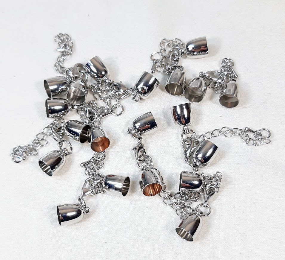 Fermoir mousqueton métal inox avec embouts cloches et chaînette de rallonge.